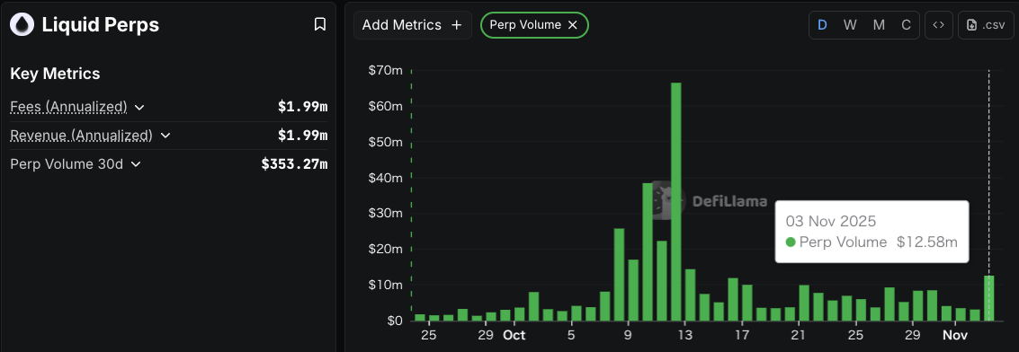 Liquidの日次ボリュームは$5〜10Mほど。良くも悪くも本格的なトレーダー向けではないため、Perp DEXとして見るとかなりの過疎状態が続いています。