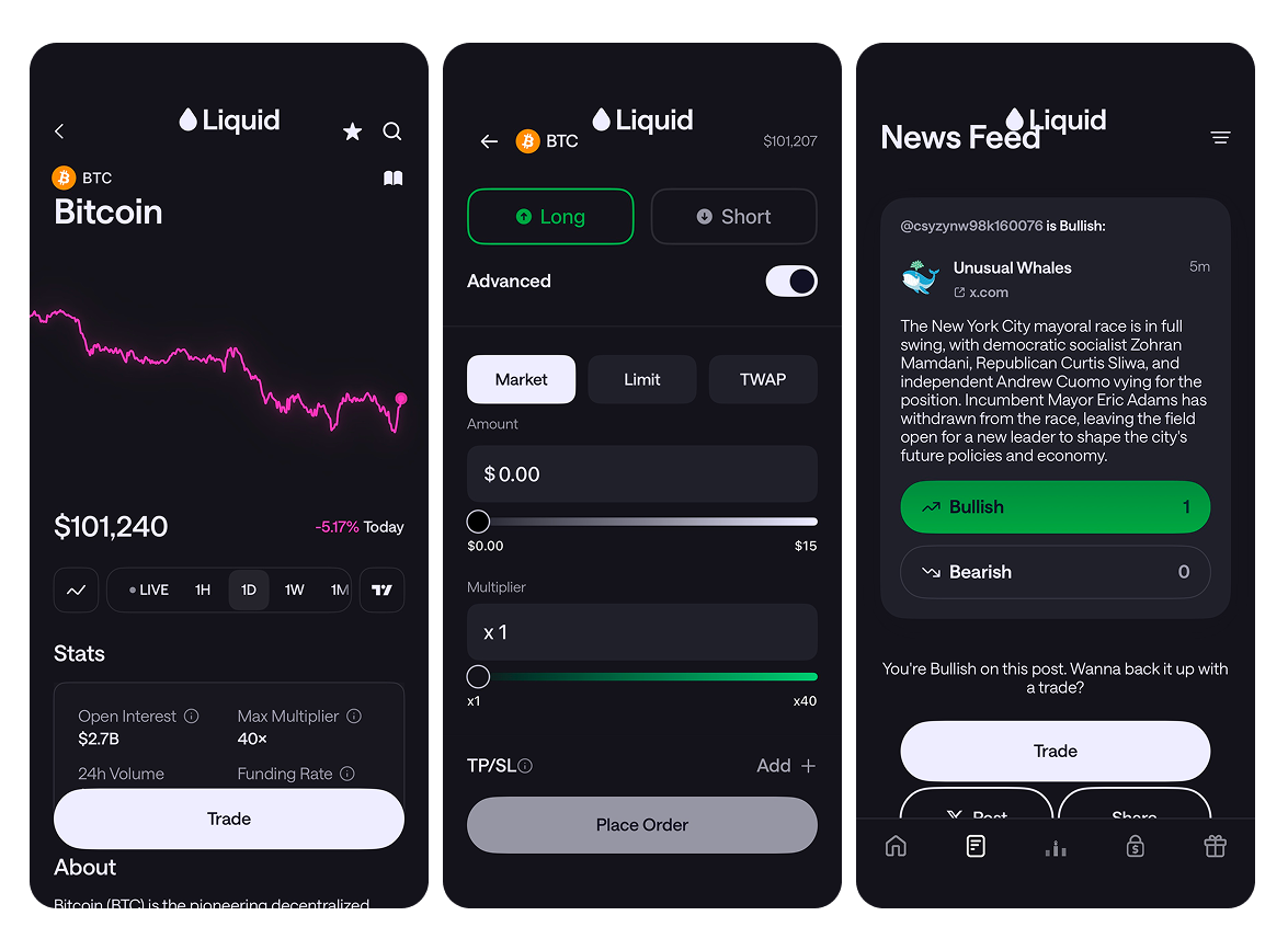 Liquidは、複数のPerp DEXを一つに統合した、スマートフォン特化のトレーディングアプリです。