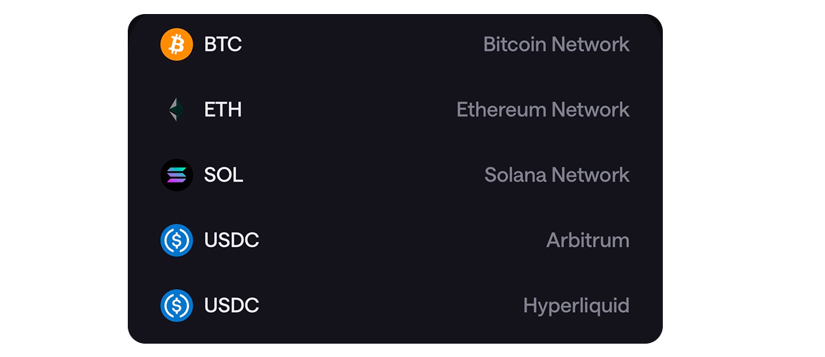 2.任意のチェーンから入金: Arbitrum/HyperliquidのUSDCあたりが効率よく入金できます。クレジットカードやApple Payからの入金もできますが、おそらく効率よくないので非推奨。