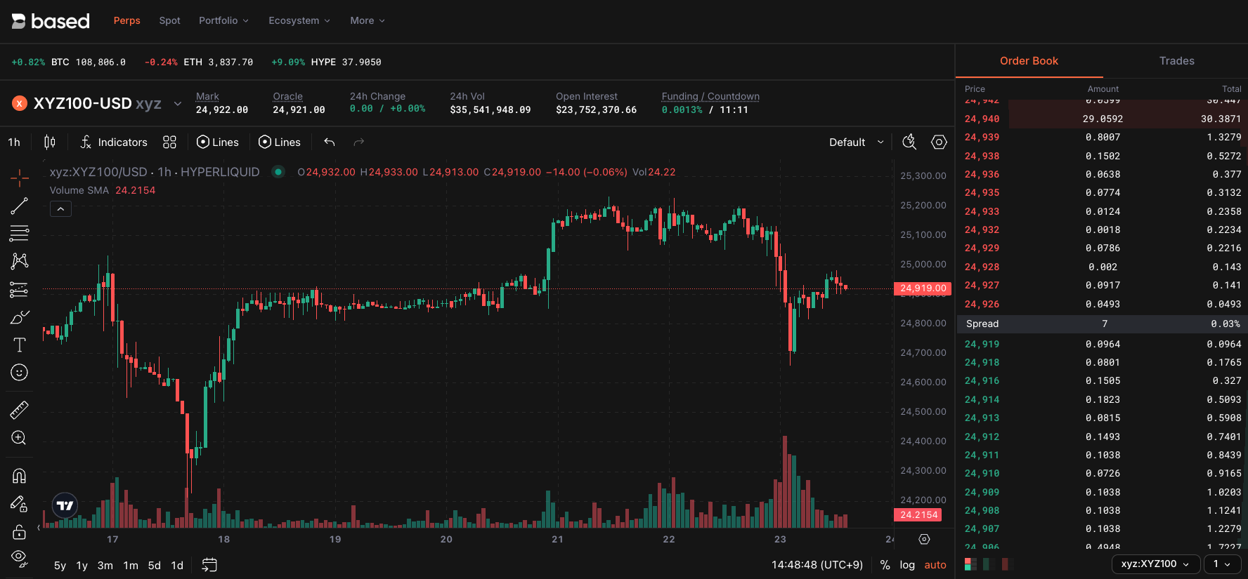 2.XYZ100を取引する:Trade.xyzが扱っている米国トップ100企業株価指数・XYZ100は外部のプロダクトでもトレードが可能です。たとえば一時期とても話題になったBasedなど。この活動の優先度は低いですが、すでに使っているHyperliquid系のプロダクトがあれば、意識的にトレードしてみるのもいいかもしれません。