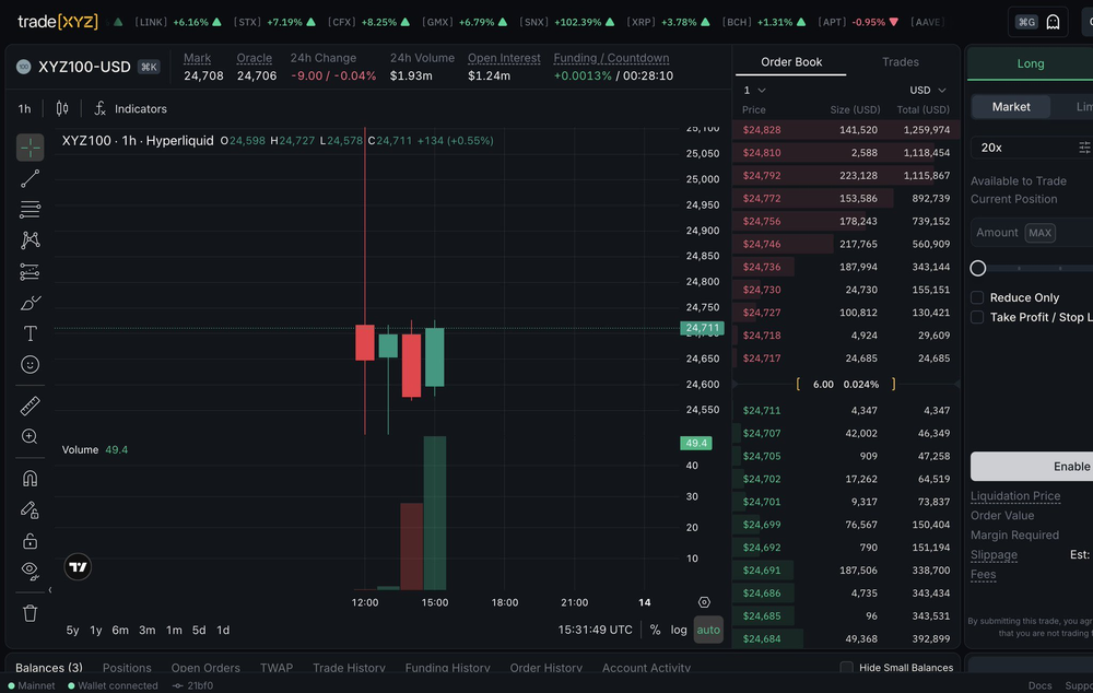 この機能を利用し、Trade.xyzは第一弾として米国トップ100企業株価指数「XYZ100」の取引を開始しました。今後は個別株式や商品、為替など、さらに多くの伝統資産が追加される予定で、24時間365日、あらゆる市場へのアクセスを可能にします。