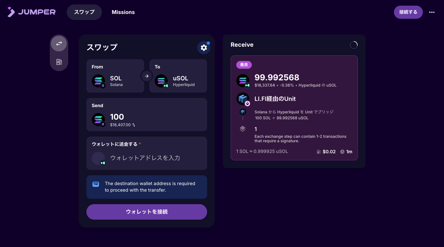 - SOLをJumper(Unit)でHyperliquidにブリッジ:https://jumper.exchange/