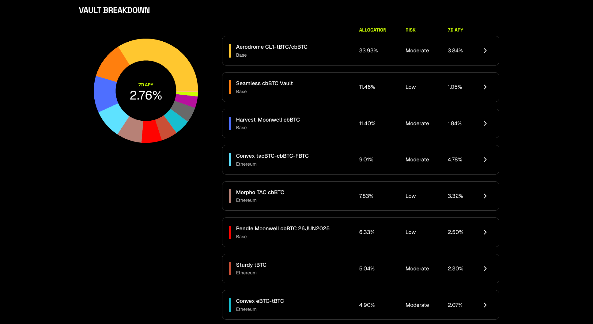 その後は、プロトコルのアルゴリズムが自動的にBase、Ethereum、Solanaといった複数のチェーンをまたいで、最もリスク対効果の高い運用先へと資産を再配置してくれます。